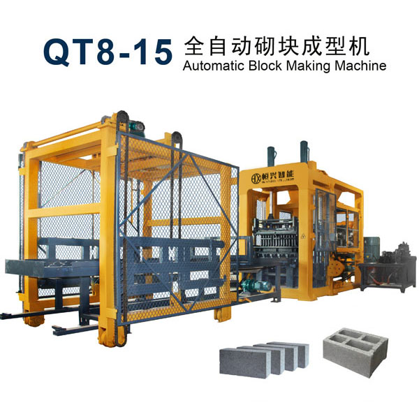 (1)QT8-15免燒磚機采用模箱垂直定向振動加壓成型,多軸旋轉式喂料裝置,破拱布料耙布料,成型周期短,生產效率高、砌塊質量密實度高、尺寸精確。